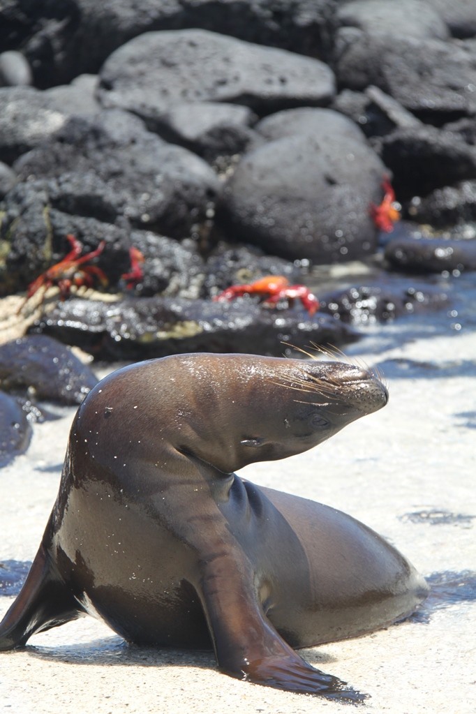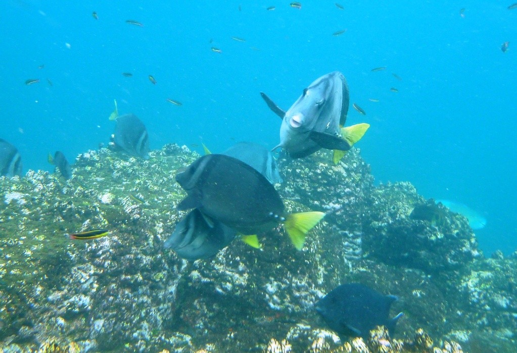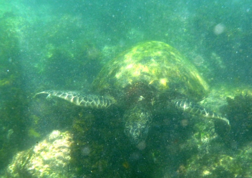 Voor de verschillende hoofdrolspelers van het beschermde zeereservaat komen we ogen te kort. Met een masker en een snorkel lijkt het wel alsof je in een gigantische aquarium duikt. Het wordt een spannend snorkelavontuur. We zwemmen voor de eerste keer samen met de witpunthaaien en de zeeschilpadden. De Galapagos pinguins zwemmen tegen een snelvaart voorbij. Mijn hart gaat sneller kloppen als de zeeleeuwen contact zoeken en ons uitnodigen om te spelen. Nieuwsgierig komen ze bijna met hun neus tegen mijn masker, maar ik mag ze niet aanraken omdat ze door menselijke geur in hun eigen kolonie verstoten worden. Dit persoonlijk contact en de verrassende close-ups staan voor altijd op mijn harde schijf geschreven.