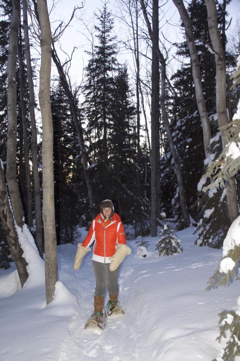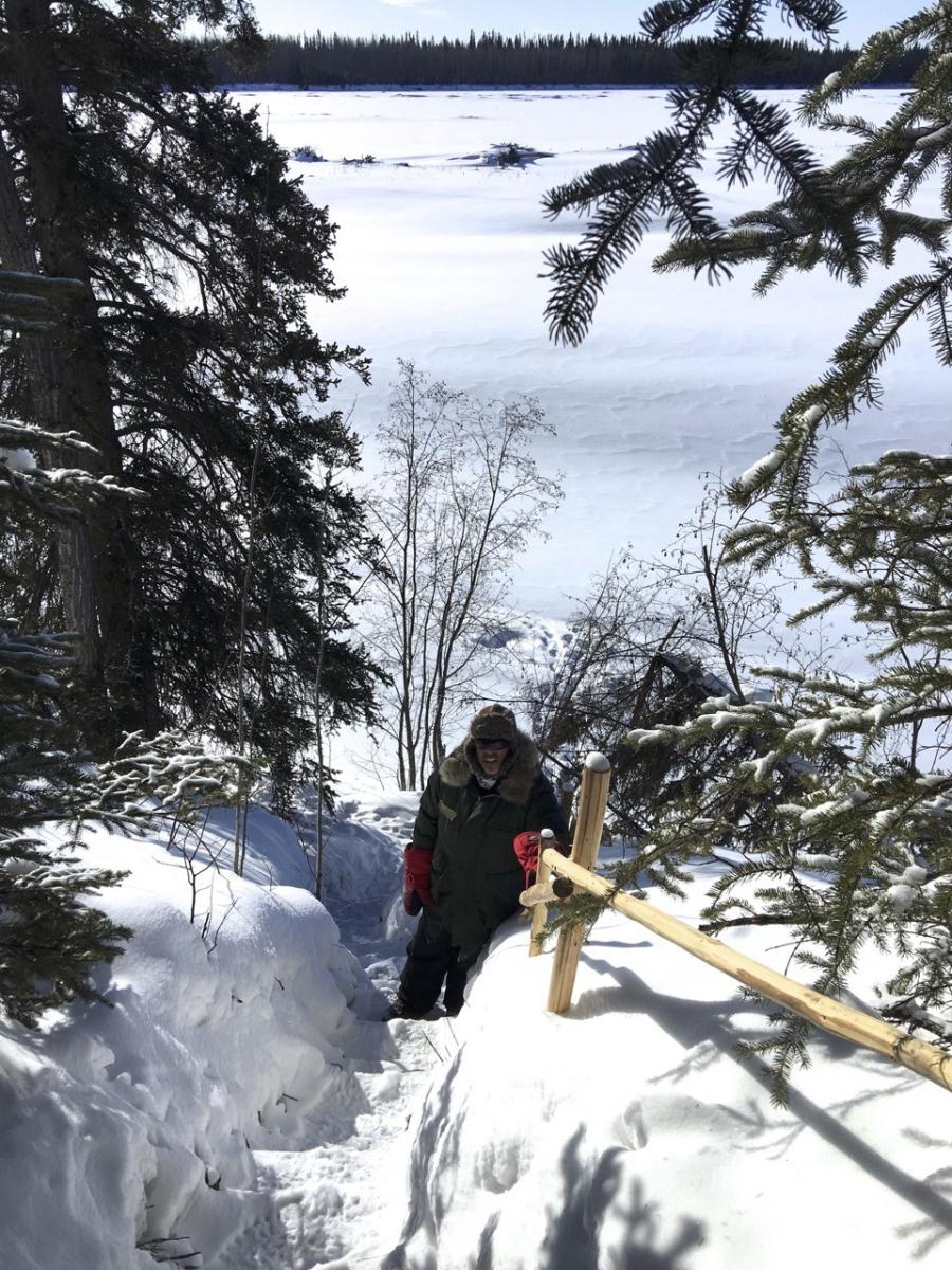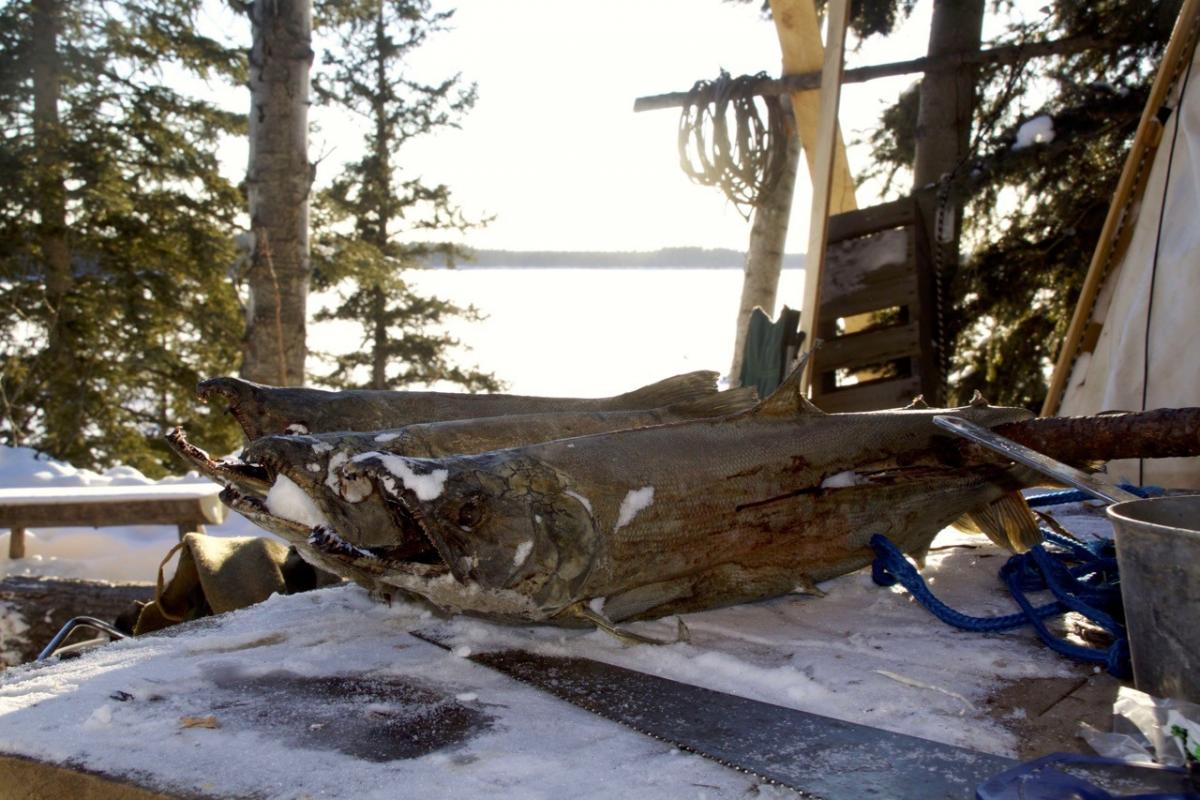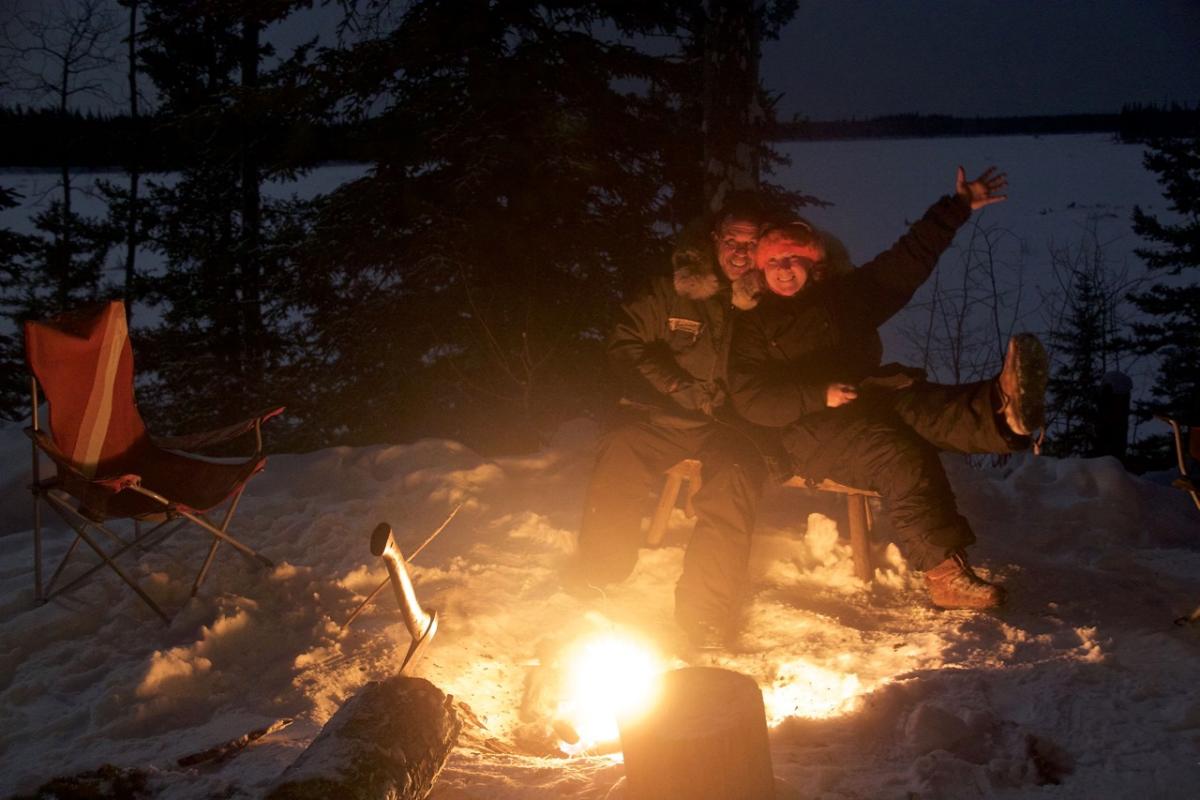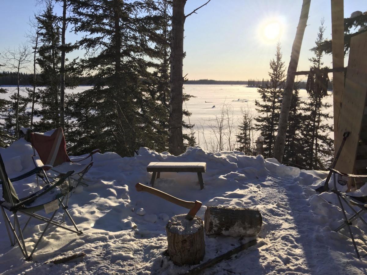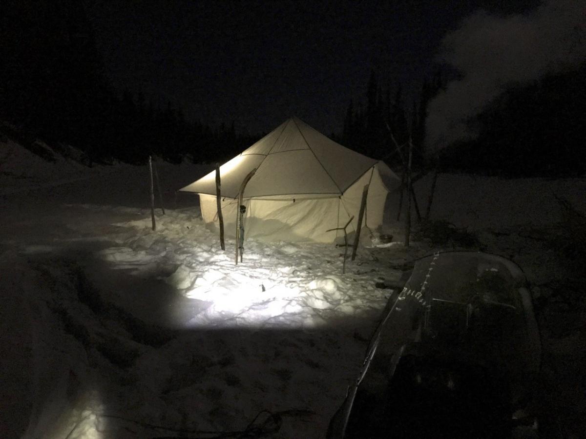 Dan stappen we met onze sneeuwschoenen het terrein plat en zagen we enkele dode bomen. Eén als nokbalk voor de tent en de rest als brandhout. Kariboe-vellen en een pak vers geplukte sparrentakken isoleren ons van de besneeuwde grond. Wij zijn nauwelijks bekwame hulp, maar het geeft ons waardering voor de inspanning en vaardigheid die nodig is om te reizen en op deze manier te leven.