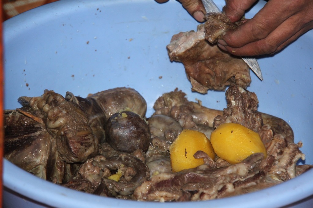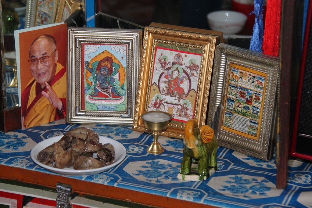 We worden ontvangen met een kommetje warme paardenmelk, verse roomkaas en gedroogde  kaaskoorden. Maar het meest gevreesde komt ook tevoorschijn:  de grote kom makh, gekookte organen, vet, hersens en de ogen van schaap. Eerst wordt er een schoteltje geofferd aan Boedha, en daarna mag iedereen naar hartelust  toetasten.Onze maag keert van de geur alleen al…  Gelukkig is onze chauffeur een grote amateur van deze fingerfood delicatesse, en hoeven we ons niet te schamen dat de kom niet leeg geraakt.