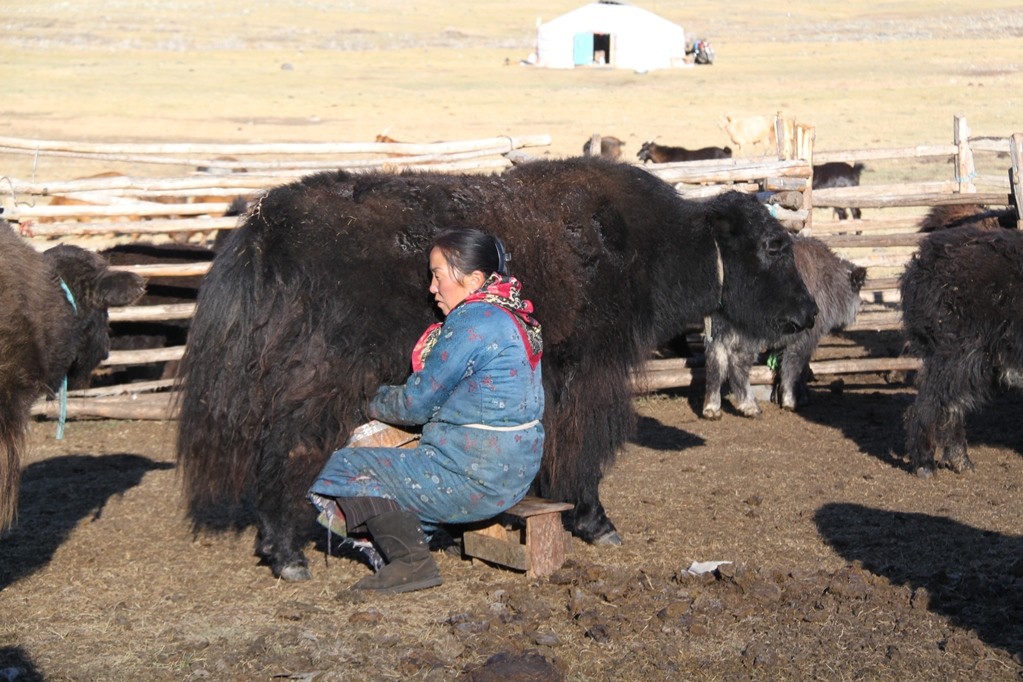 Bij het krieken van de dag is onze gastvrouw de Yaks al aan het melken.We helpen haar en brengen de volle emmers terug naar de Ger. De melk van de Yaks is bijna geklopte room, zo dik. Maar al dat vet helpt een nomaad de winter door.